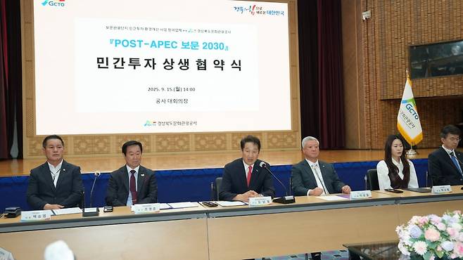 경북문화관광공사(사장 김남일)는 15일 글로벌 호텔브랜드를 운영할 우양산업개발(대표 조영준), 관광형 양조장에 투자하는 부산 골든블루(대표 박소영), 리조트형 호텔을 운영할 대구 케이케이(대표 박윤경) 등 11개 투자기업과 5000억원 규모의 ‘포스트 APEC 보문 2030 민간투자 상생업무협약’을 체결했다.