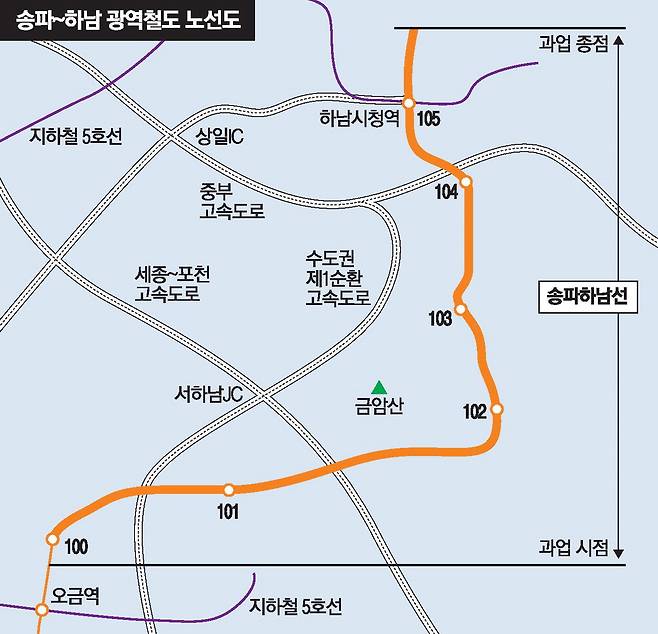 송파하남선은 지난 7월 22일 국토부 대도시권광역교통위원회에서 기본계획 승인을 받았다. 승인된 기본계획에는 △서울지하철 3호선 오금역에서 하남 감일지구~교산신도시~5호선 하남시청역까지 6개 역사 설치 △지하철 5·8호선 GTX·SRT 등과 환승 연계 △하남 교산신도시 입주민의 출퇴근 시간 대폭 단축(하남시청에서 강남고속버스터미널까지 버스 기준 70분에서 40분으로 단축) 등이다.
