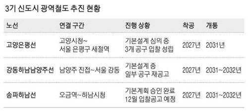 15일 경기도에 따르면 3기 신도시와 연계된 주요 광역철도 사업은 △고양은평선 △강동하남남양주선 △송파하남선 등 3개 노선이다. 이들 노선은 모두 2027년 착공을 목표로 추진되고 있으며, 2031~2032년 사이 개통이 예정돼 있다.