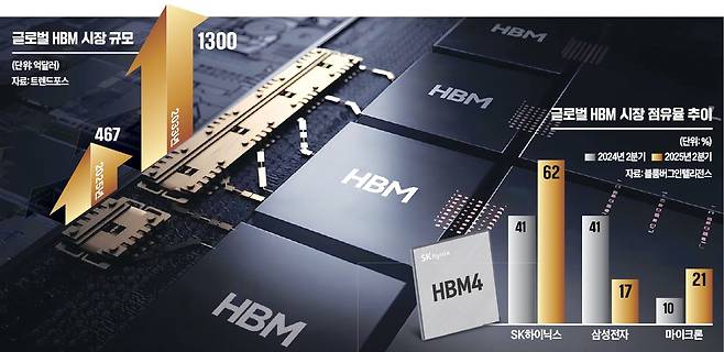 최대 관심은 HBM4 시장에서 누가 먼저 유리한 고지에 오르는지다. SK하이닉스는 업계 최초로 HBM4 샘플을 공급한 데 이어 양산 체제를 발 빠르게 갖추며 속도전을 펴고 있다. 삼성전자는 HBM4 D램에서 SK하이닉스보다 한 세대 앞선 10나노미터(㎚·1㎚=10억분의 1m)급 1c 공정을 적용한 기술력으로 사활을 걸고 있다. 마이크론은 HBM4보다 서버용 더블데이터레이트(DDR)5 공급 확보에 주력하고 있다. HBM의 월 생산능력 측면에서는 삼성전자가 SK하이닉스보다 우위에 있는 것으로 알려졌다.