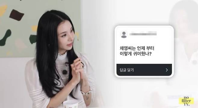“채영 씨는 언제부터 이렇게 귀여웠나?”라는 질문에 채영은 웃음을 터트리며 “팬 분들이 제가 데뷔한 지 10년이 됐는데도 너무 그대로인 것 같다고, 귀엽다고 해주시는데 약간 이제는 (귀여움에서)졸업을 해야 되지 않나 (생각 한다)”라고 털어놨다. 이에 김나영은 채영을 향해 “한참 귀여워도 된다”라고 팬 모드 반응을 보이기도.