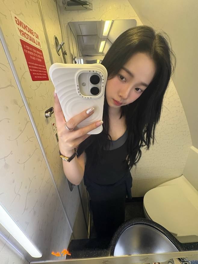 비행기 화장실 거울 앞에서 자연스러운 셀카를 남긴 사진에서는 카리나 특유의 우아함과 맑은 피부가 돋보인다.