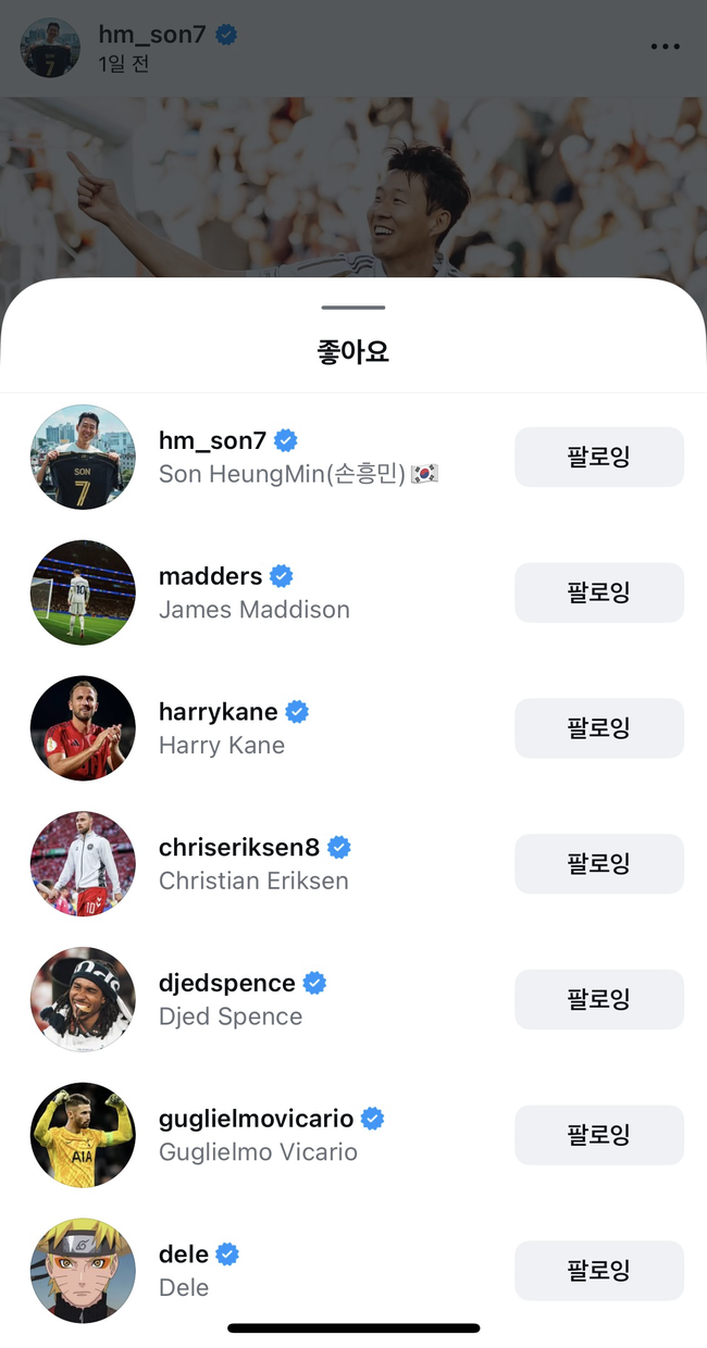 토트넘에서 함께 활약한 굴리엘모 비카리오, 아치 그레이, 도미닉 솔란케, 데스티니 우도기, 제임스 매디슨은 ‘좋아요’를 누르며 손흥민의 골과 승리를 축하했다. 과거 토트넘에서 ‘DESK 라인’을 구성했던 크리스티안 에릭센, 해리 케인, 델레 알리 또한 ‘좋아요’로 손흥민에게 애정을 드러냈다.
