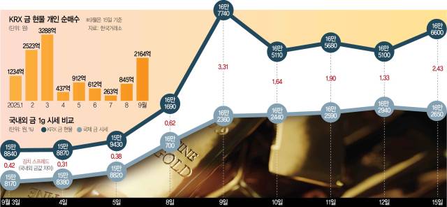 실제로 KRX 금 현물 가격이 16만 7740원으로 사상 최고가를 경신한 9일 기준 김치 프리미엄은 3.31%까지 튀었다. 올해 3월 7일(3.24%) 이후 6개월 만에 최대다. 당시 개인 순매수 금액이 416억 원으로 전일 대비 210% 급증하면서 국제 금 환산액(16만 2360원) 대비 국내 시세가 급격히 올랐다.
