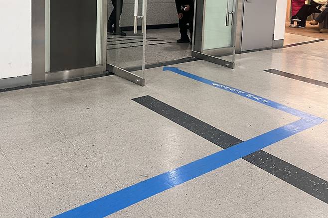 | ▲ 이경미 디자이너가 자문한 서울 고척돔의 색깔 바닥띠. 유동인구가 많고 길이 낯설 때 유용하게 쓰인다. |