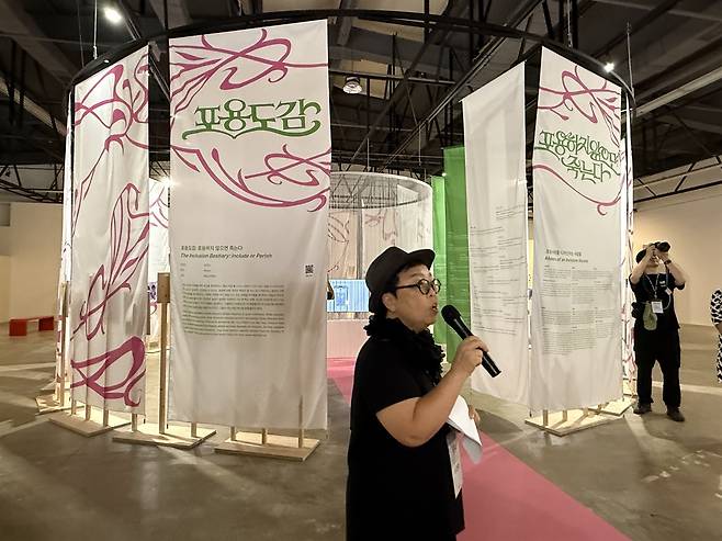 | ▲ 포용을 테마로 한 게임인 '포용도감' 전시를 소개하고 있는 이경미 광주디자인비엔날레 '포용디자인과 삶'관 큐레이터 |