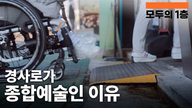 | ▲ 2025 광주디자인비엔날레 전시 '포용디자인과 삶'관에 초대된 '모두의 1층' 프로젝트 영상. 경사로를 설치하면 누구나 1층에 들어갈 수 있다는 컨셉의 프로젝트로 접근성의 기본 단위인 경사로 설치와 확대를 위한 환경 조성을 목표로 한다. |
