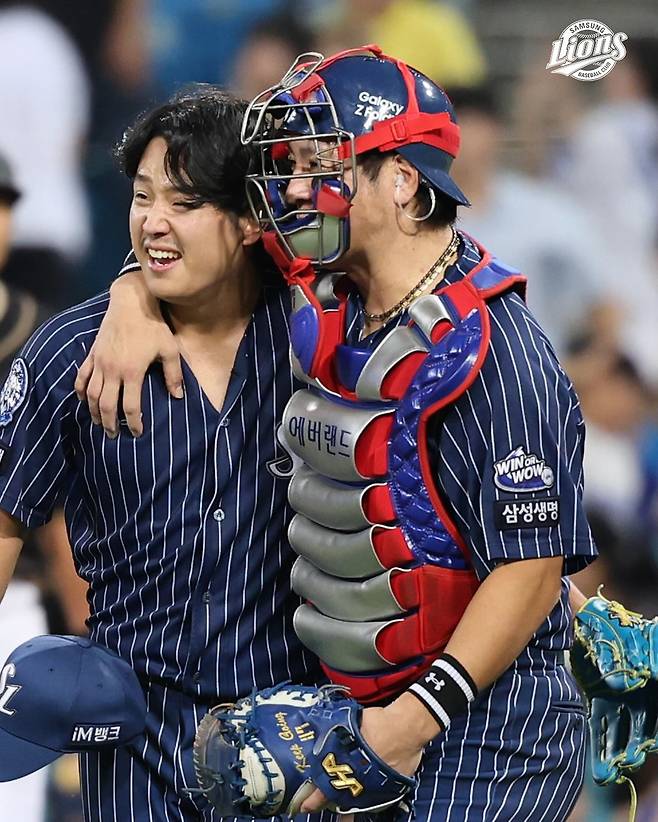 | ▲ 경기 후 강민호와 함께 기뻐하고 있는 양창섭 |