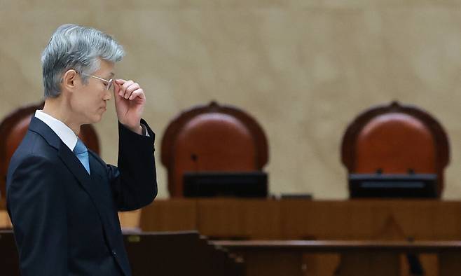 위기의 대법원장 조희대 대법원장이 지난 12일 서울 서초구 대법원 중앙홀에서 열린 ‘2025 대한민국 법원의 날 기념식’에서 시상에 앞서 안경을 고쳐 쓰고 있다. 연합뉴스