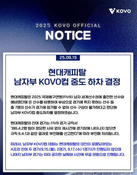 남자 프로배구 현대캐피탈이 V리그 전초전 격인 2025 여수·NH농협컵 프로배구대회(컵대회)에서 중도 하차하기로 했다.