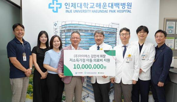 ㈜아이에스 김인석 회장은 지난 10일 초록우산(부울경권역총괄본부장 이수경)에 인제대학교 해운대백병원에 저소득가정 아동을 위한 의료비 1000만 원을 후원(사진)했다고 15일 밝혔다.