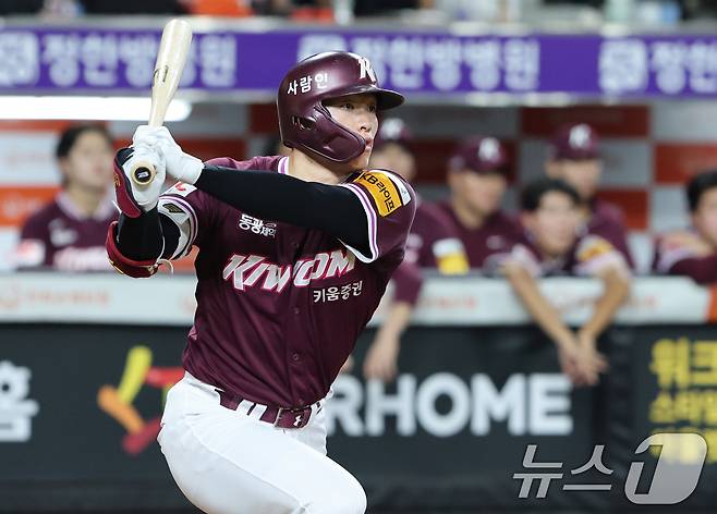 (대전=뉴스1) 김기태 기자 = 15일 오후 대전 한화생명 볼파크에서 열린 프로야구 '2025 신한 SOL뱅크 KBO 리그' 키움 히어로즈와 한화 이글스 경기에서 4회초 1사 키움 임병욱이 3루타를 치고 있다. 2025.9.15/뉴스1
