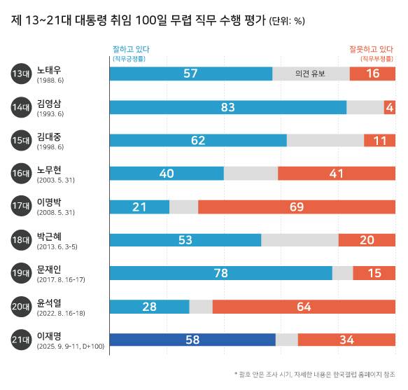 역대 대통령들이 받아든 취임 100일 성적표와 비교하면 이 대통령은 분명 '우등생'에 가깝다. 한국갤럽이 지난 9~11일 전국 만 18세 이상 유권자 1002명을 대상으로 이 대통령의 직무 긍정 평가를 조사한 결과 58%였다(표본오차는 95% 신뢰수준에 ±3.1%p, 접촉률은 45.7%, 응답률은 11.8%).