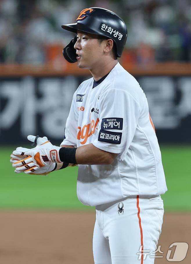 (대전=뉴스1) 김기태 기자 = 15일 오후 대전 한화생명 볼파크에서 열린 프로야구 '2025 신한 SOL뱅크 KBO 리그' 키움 히어로즈와 한화 이글스 경기에서 4회말 무사 만루 한화 황영묵이 1타점 적시타를 치고 출루해 환호하고 있다. 2025.9.15/뉴스1