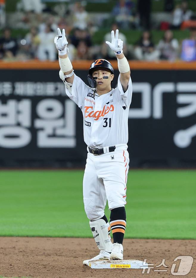 (대전=뉴스1) 김기태 기자 = 15일 오후 대전 한화생명 볼파크에서 열린 프로야구 '2025 신한 SOL뱅크 KBO 리그' 키움 히어로즈와 한화 이글스 경기에서 4회말 무사 만루 한화 손아섭이 2타점 2루타를 치고 베이스에 안착해 환호하고 있다. 2025.9.15/뉴스1