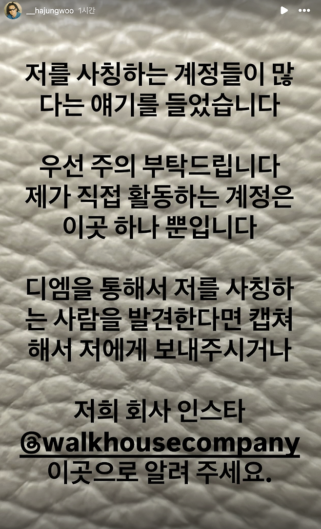하정우는 15일 SNS에 "저를 사칭하는 계정이 많다는 얘기를 들었다. 우선 주의를 부탁드린다. 제 계정인 1개뿐"이라고 밝혔다.