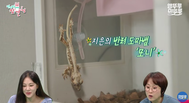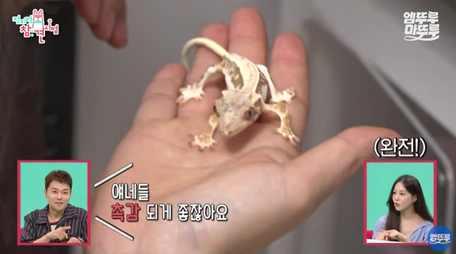 크레스티드 게코 도마뱀 '모니'에게 물과 먹이를 챙겨주는 모습도 담겼다. 매니저는 "지인에게 분양받아 키우고 있다. 5개월 정도 됐다"고 설명했다.