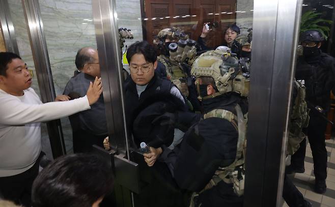 | ▲ 윤석열 대통령이 비상계엄을 선포한 가운데 2024년 12월 4일 오전 서울 여의도 국회 로텐더홀에 무장한 계엄군이 진입을 시도하자, 당직자와 보좌진들이 이를 막고 있다. |