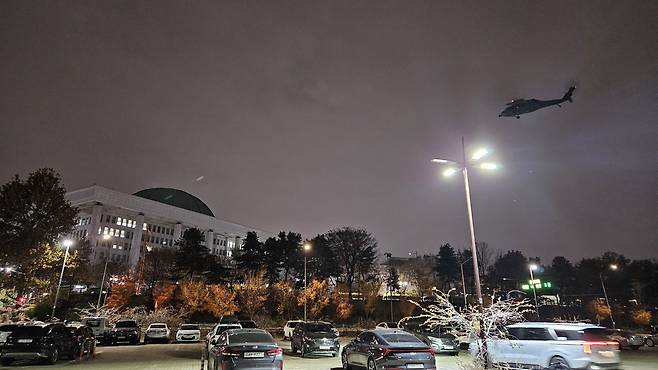 | ▲ 윤석열 대통령이 긴급 담화를 통해 비상계엄을 선포한 가운데 2024년 12월 3일 밤 여의도 국회의사당 위에 헬기들이 떠 있다. |