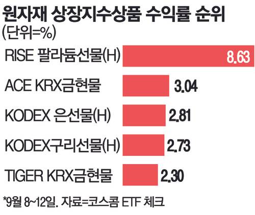 지난 한 주 국내 원자재 상장지수상품 가운데 팔라듐 선물 상장지수펀드(ETF)가 가장 높은 수익률을 기록했다.