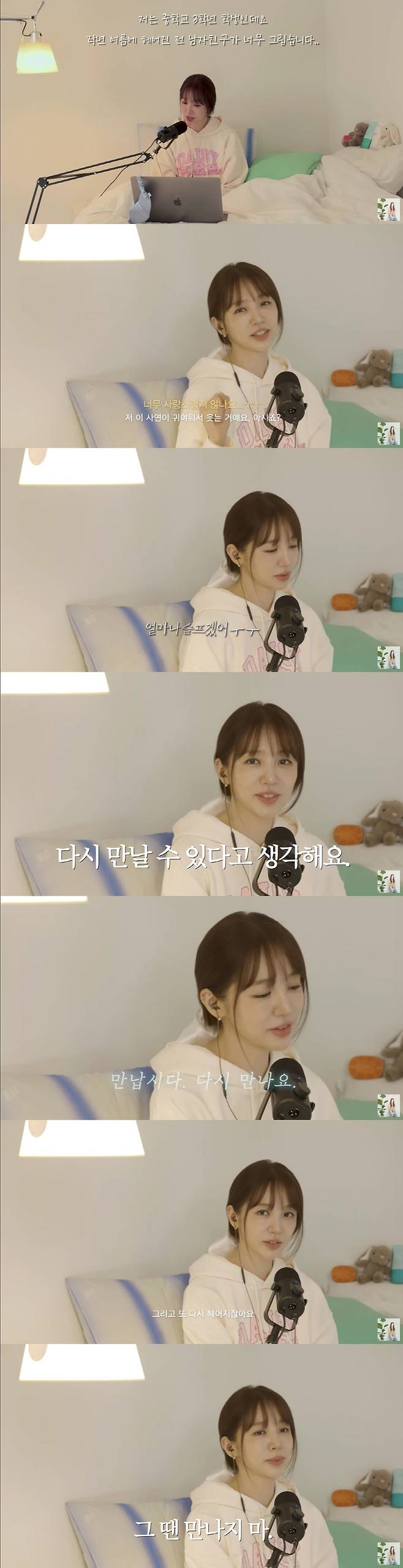 이날 중학교 3학년이라고 밝힌 한 팬은 "작년 여름에 헤어진 전 남자친구가 너무 그립다"며 솔직한 고민을 털어놓았다.