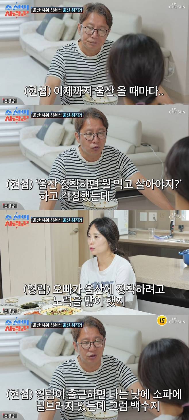 이어 심현섭은 "영림이는 출근하고 나는 낮에 소파에 널브러져 있는 백수였다. 그러던 차에 '울산시대'라는 복이 굴러들어온 거다"라며 울산에서의 취직에 대한 기쁜 마음을 드러냈다. 심현섭의 속마음을 들은 정영림은 "고생 많았다"라며 위로했다.