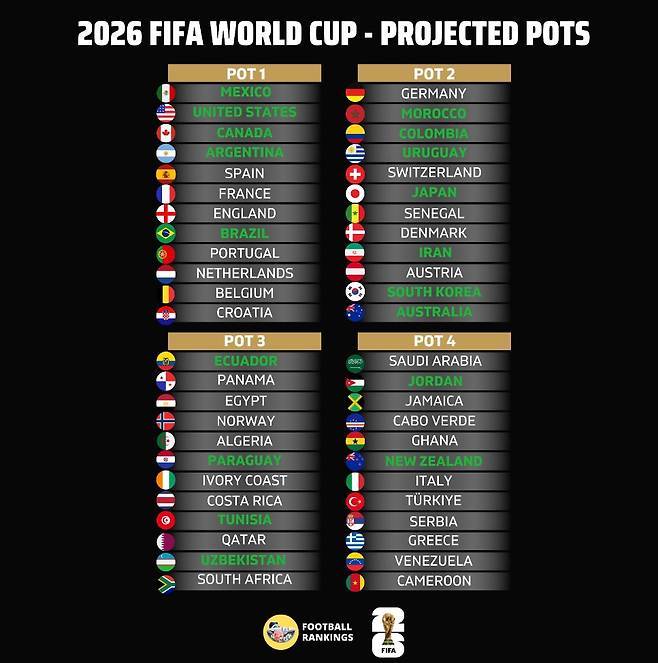 한국이 오는 12월에 진행되는 2026 국제축구연맹(FIFA) 북중미 월드컵(캐나다·미국·멕시코 공동개최) 조별리그 추첨 전까지 현 순위를 유지하면 역대 최초로 포트2에 배정될 가능성이 높다.