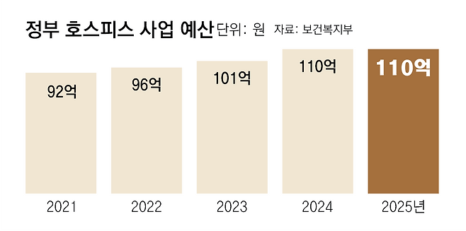 다만 의료계 현장에서는 호스피스 서비스를 이용할 수 있는 질환이 늘어도 환자들을 모두 수용하기 어렵다는 의견이 나온다. 수가(건강보험으로 지급하는 진료비)가 낮아 의료기관이 관련 인프라를 확충할 이유가 적기 때문이다. 김철민 서울성모병원 가정의학과 교수는 “암을 제외한 나머지 질환은 기대여명을 예측하기 어렵다”며 “이들까지 모두 호스피스에 입원하기에는 사회적인 재원도 부족한 상황”이라고 말했다.