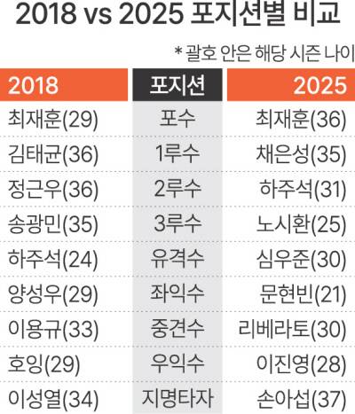 한화는 올해도 시즌내내 타격 침체와 수비 불안으로 고전하면서도 7년 전과 비교해 전력 밸런스는 좋다. 시즌 중 영입한 손아섭에 포수 최재훈, 1루수 채은성으로 이어지는 베테랑들이 중심을 잘 잡아줬다. 3년차 외야수 문현빈과 2년차 내야수 황영묵이 주전으로 자리매김한 사이 중심타자로 입지를 굳힌 노시환, 프로 10년차에 최고 시즌을 보내는 외야수 이진영이 연결 고리가 된다. 자유계약선수(FA)로 영입한 심우준과 안치홍이 오랜 슬럼프에 빠진 위기를 넘길 수 있었던 동력이다.
