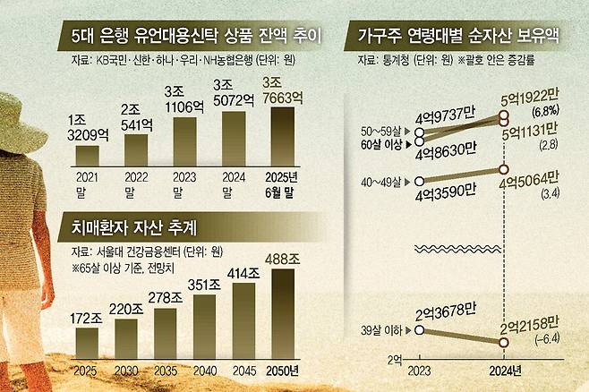 초고령사회에 본격 진입한 한국에서 고령층 자산, 이른바 ‘시니어 머니’가 자본시장의 주류로 부상하고 있다. 지난해 처음으로 65살 이상 인구 비중이 20%를 넘어선 가운데 60살 이상 고령층의 총 순자산이 4300조원에 이르는 등 급증세를 보인다. 향후 10~20년 사이에 이들 자산의 상당 규모는 이후 세대에 이전될 터다. 은행 등 금융권이 고령층 자산을 중심에 둔 경쟁을 본격화하고 있는 까닭이다.