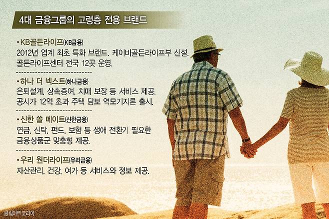2012년 업계 최초로 고령층 전용 브랜드 ‘케이비(KB)골든라이프’를 내놓은 선두주자 케이비금융그룹은 최근 조직개편 때 케이비골든라이프부를 신설하고 서울·수도권 중심으로 5곳을 운영 중이던 골든라이프센터를 전국 12곳으로 확장했다. 은행은 증여 전반에 대한 서비스, 손보는 간병보험, 카드는 고령층 건강·문화 등에 초점을 맞춘 상품 등으로 대응하고 있다.