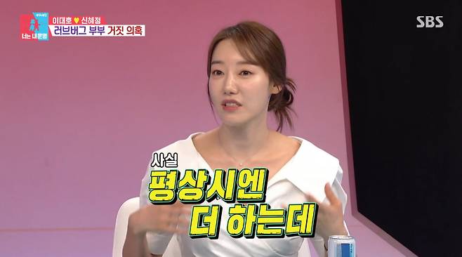 이대호 부부는 모닝키스와 스킨십으로 아침 인사하며 달달함을 자랑했다. 한도 초과 달달함에 MC 이현이는 "저거 연출이지 않나"라고 의혹을 제기했다. 김숙도 "저건 그림이다"고 거들었다. 신혜정은 "평상시엔 더 하는데, 솔직히 진짜 조금 덜했다"고 해명했다.