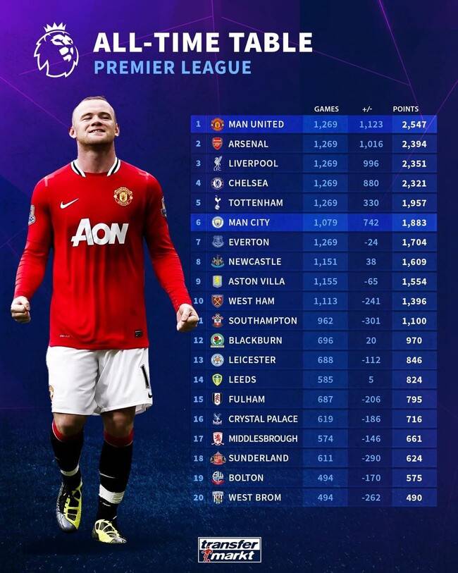 1위는 맨유였다. 1,269경기에서 총 승점 2,547점을 획득하고 있었다. 2위 아스널과의 승점 차는 153점. 2위 아스널부터 4위 첼시 사이의 격차가 73점에 불과한 것을 고려해볼 때 굉장히 큰 격차라고 볼 수 있다.