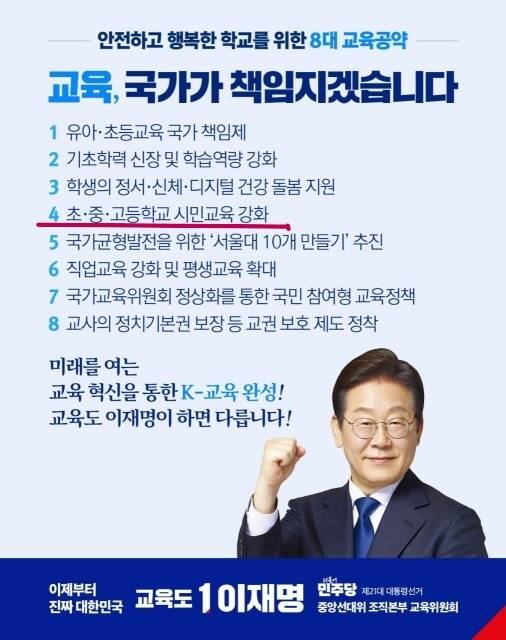 | ▲ <초중고 시민교육 강화>를 대선 교육공약으로 내건 포스터 21대 대선 당시 이재명 후보 중앙선대위 교육위원회에서 내건 교육공약 포스터 |