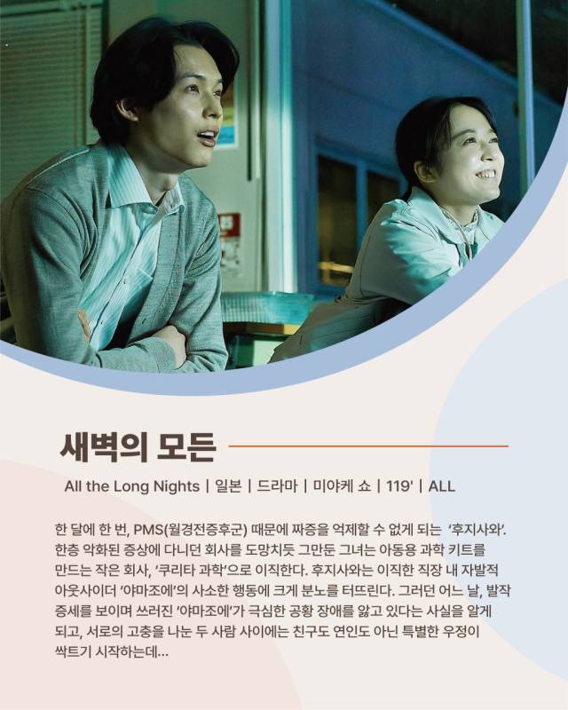 2024년 제25회 전주국제영화제 개막작이었던 ‘새벽의 모든’은 일본 작가 세오 마이코의 동명 소설이 원작이다. 월경전증후군(PMS)을 겪는 후지사와(카미시라이시 모네)와 공황장애를 앓는 그의 동료 야마조에(마츠무라 호쿠토)를 중심으로 특별한 우정과 연대를 다룬다.