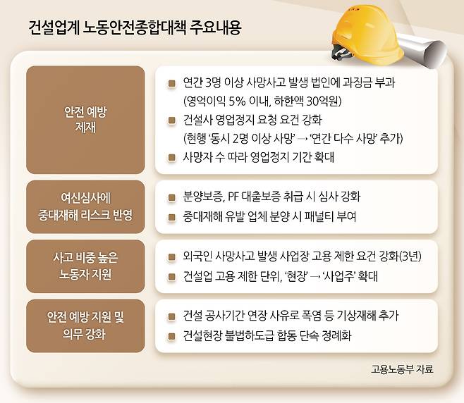 고용노동부가 내놓은 대책의 핵심은 연간 3명 이상 산재 사망사고가 발생한 법인에 대해 영업이익 5% 이내 과징금을 부과하는 것이다. 이를 비롯해 영업정지와 공공입찰제한, 등록말소 등 강화된 규제가 적용된다.