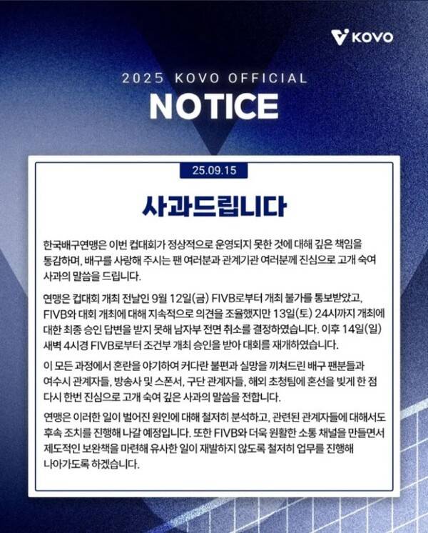 연맹은 "이번 컵대회가 정상적으로 운영되지 못한 것에 대해 깊은 책임을 통감하며, 배구를 사랑해 주시는 팬 여러분과 관계기관 여러분께 진심으로 고개 숙여 사과의 말씀을 드린다"고 말했다.