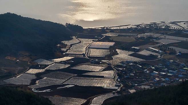 ▲ 오봉산 정상에서 바라본 득량만 일대