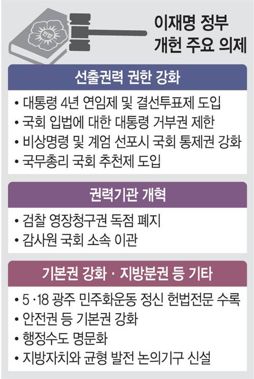 이날 국무회의에서 확정된 개헌 방안엔 이 대통령이 대통령선거 후보 시절 공약했던 대통령 4년 연임제 및 결선투표제 도입이 포함됐다. 이 대통령은 대선 후보 당시 4년 연임제를 정권에 대한 국민의 중간평가로 규정했고, 결선투표제는 민주적 정당성을 확보하는 절차라고 설명했다. 현행 헌법상 개헌 당시 재임 대통령에게 임기 연장·중임 변경을 위한 개헌은 적용되지 않지만, 국민적 지지를 최고의 판단 기준으로 삼아 대통령의 연임 가능성을 열 수도 있을 것이란 관측이 나온다. 이 대통령은 대선 때 “개헌 당시 대통령이 추가 혜택을 받는 것에 대해 국민이 쉽게 용인하지 않을 것”이라면서도 “국민 입장을 존중해야 한다”고 한 바 있다.