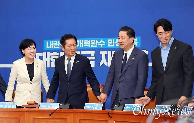 | ▲ 정청래-김병기 '갈등봉합' 최근 특검법 개정안 여야 합의를 두고 갈등을 빚은 더불어민주당 정청래 대표와 김병기 원내대표가 지난 15일 서울 여의도 국회에서 열린 최고위원회의에 참석, 손 잡고 인사하고 있다. |