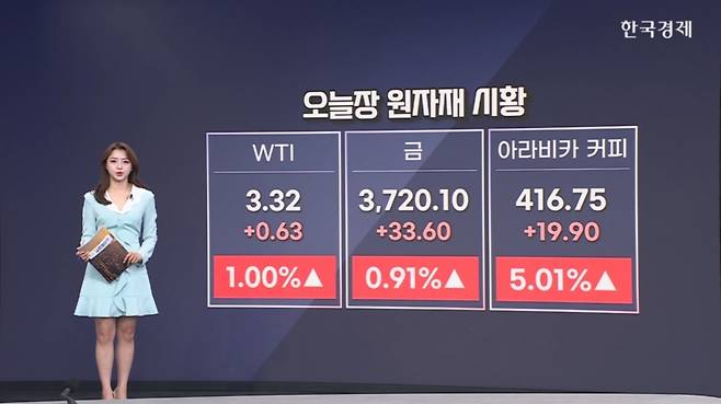 네, 원자재 시황도 살펴보겠습니다. 5시 수치를 기준으로 하고 있고요. 오늘장 눈에 띄었던 원자재 이슈들 보면, 국제유가는 우크라이나의 러시아 정유시설 공격과 트럼프 대통령 발언에 1% 상승했고요. 금은 금리인하 기대감 속 달러 약세 여파로 0.9% 올랐습니다. 아라비카 커피 선물은 파운드당 4달러를 돌파하며 2월 이후 최고치를 기록했습니다.