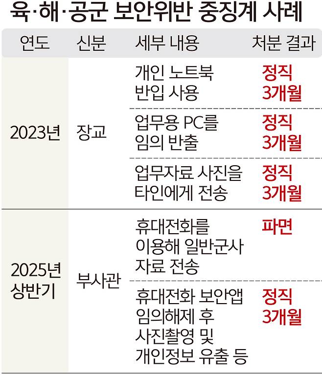 연도별로 △2020년 5613건 △2021년 5341건 △2022년 4423건 △2023년 3852건 △2024년 3397건 △2025년 상반기 1066건이다. 신분별로는 △장교 348건 △준사관 6건 △부사관 228건 △병사 2만3107건 △군무원 16건이다. A씨처럼 휴전선 부근인 감시초소(GP)와 GOP에서 육군의 보안 위반은 같은 기간 71건이었다.
