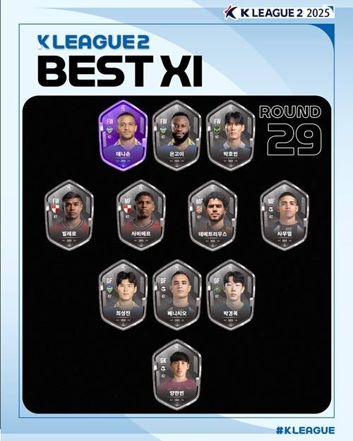 '하나은행 K리그2 2025' 29라운드 MVP는 충남아산 데니손이 차지했다. 데니손은 13일 이순신종합운동장에서 열린 충남아산과 부천의 경기에서 1골 1도움을 기록하며 이날 충남아산이 기록한 3골 중 2골을 책임지는 맹활약을 펼쳤다. 충남아산은 은고이, 데니손, 김종석이 득점을 터뜨리며 3-0 승리를 거뒀고, K리그2 29라운드 베스트 팀에도 선정됐다.