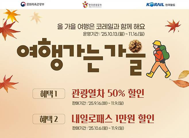 한국철도공사(코레일)는 문화체육관광부가 주최하는 '2025 여행가는 가을' 프로모션에 참여해 5개 노선의 관광열차 운임·요금을 50% 할인한다고 16일 밝혔습니다.