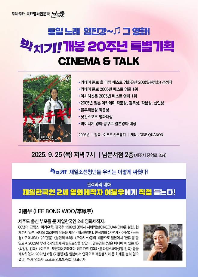 1960년대 재일조선청년들의 질풍노도를 그린 청춘영화 '박치기!' 개봉 20주년을 기념한 특별 상영회가 오는 25일 제주에서 열린다.