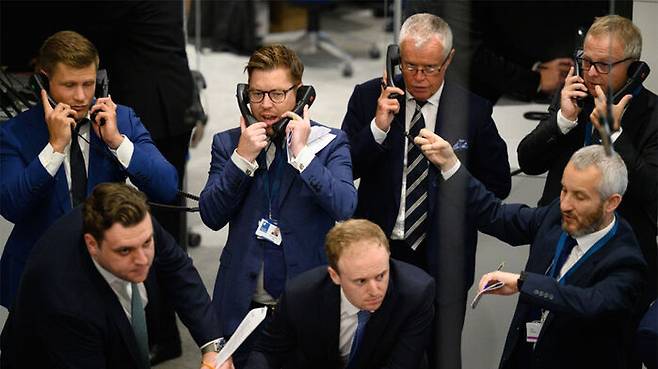 ▲ 런던금속거래소(LME)에서 트레이더, 브로커들이 제스처를 취하고 있다.
