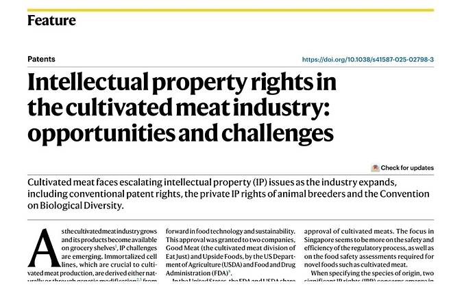 국내 연구진이 배양육(cultivated meat) 산업에서의 지식재산권(IP) 갈등에 대해 세계적 권위 학술지 '네이처 바이오테크놀로지'에 밝혔다.