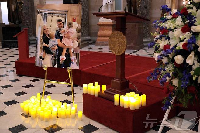 (워싱턴 AFP=뉴스1) 권영미 기자 = 미국 워싱턴 D.C. 미국 국회의사당 내 새추어리홀에서 열린 추모 촛불 집회 이후인 15일(현지시간), 피살된 보수 성향 지도자이자 터닝포인트 USA 창립자인 찰리 커크와 그의 가족 사진 앞에 전기 촛불들이 놓여 있다.