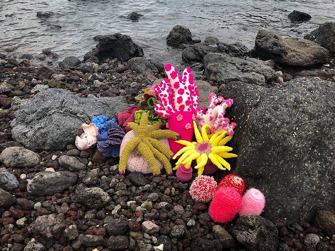 | ▲ 제주 바닷가에 놓인 ‘제주산호뜨개’ |