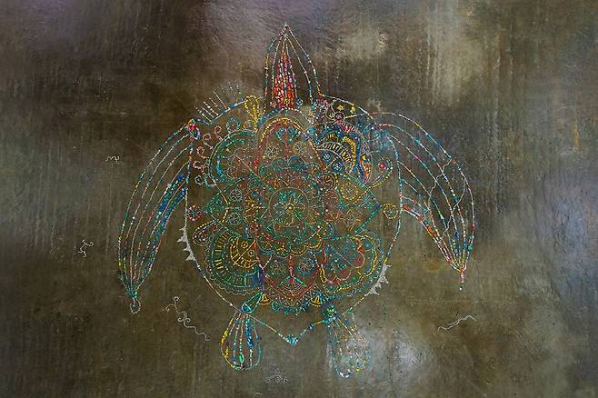 작업실로 돌아와 모은 조각을 색깔별로 분류한다. 다시금 무릎을 꿇고 기도하듯 엎드려 플라스틱 조각을 하나하나 수놓듯이 내려놓는다. 사방이 고요해진다. 서서히 만다라가 그려질수록 바다를 생각하는 마음이 공간을 채운다. 그 마음은 고통이다. 여러 사람이 힘을 합쳐 오랜 시간 거대한 만다라를 만들었을 때, 다시 흩어버린다. 비로소 플라스틱 만다라가 완성되었다.